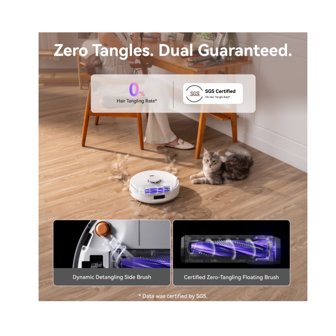 Dynamic detangling side brushes and zero-tangling floating brush work in sync—SGS certified with a 0%* hair tangling rate.