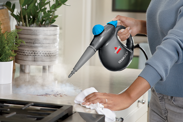 Take the natural, cleaning and sanitizing power of steam to a variety of hard surfaces in your home with BISSELL® Steam Shot™ handheld steam cleaner and Sanitizer. This lightweight steam cleaner eliminates 99.9% of germs and bacteria* on hard surfaces across your home. It comes with 9 tools including a fabric steamer, window cleaner tools and an extension hose for extended reach, so it works on shower doors, grout, ovens, microwaves, and so much more.