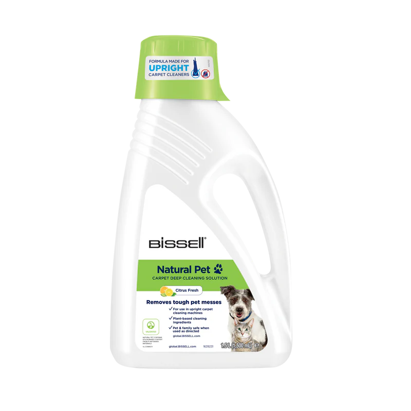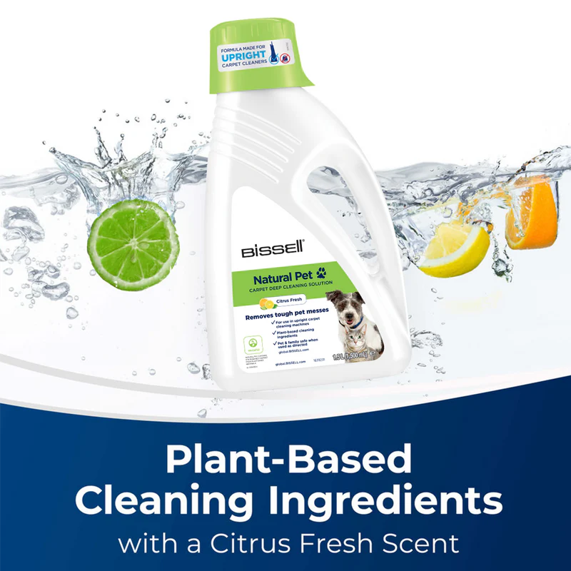 This carpet cleaning solution from BISSELL is made from natural, biodegradable plant materials. This product can be used in all BISSELL® upright carpet cleaning machines and in all BISSELL® SpotClean Pro Series machines to remove urine and feces from carpets and to make them smell and look fresh with a clean citrus fragrance. The product is safe to use on carpets, area rugs, upholstery & any other surfaces in your house; it is also child- and pet-safe when used according to its directions.