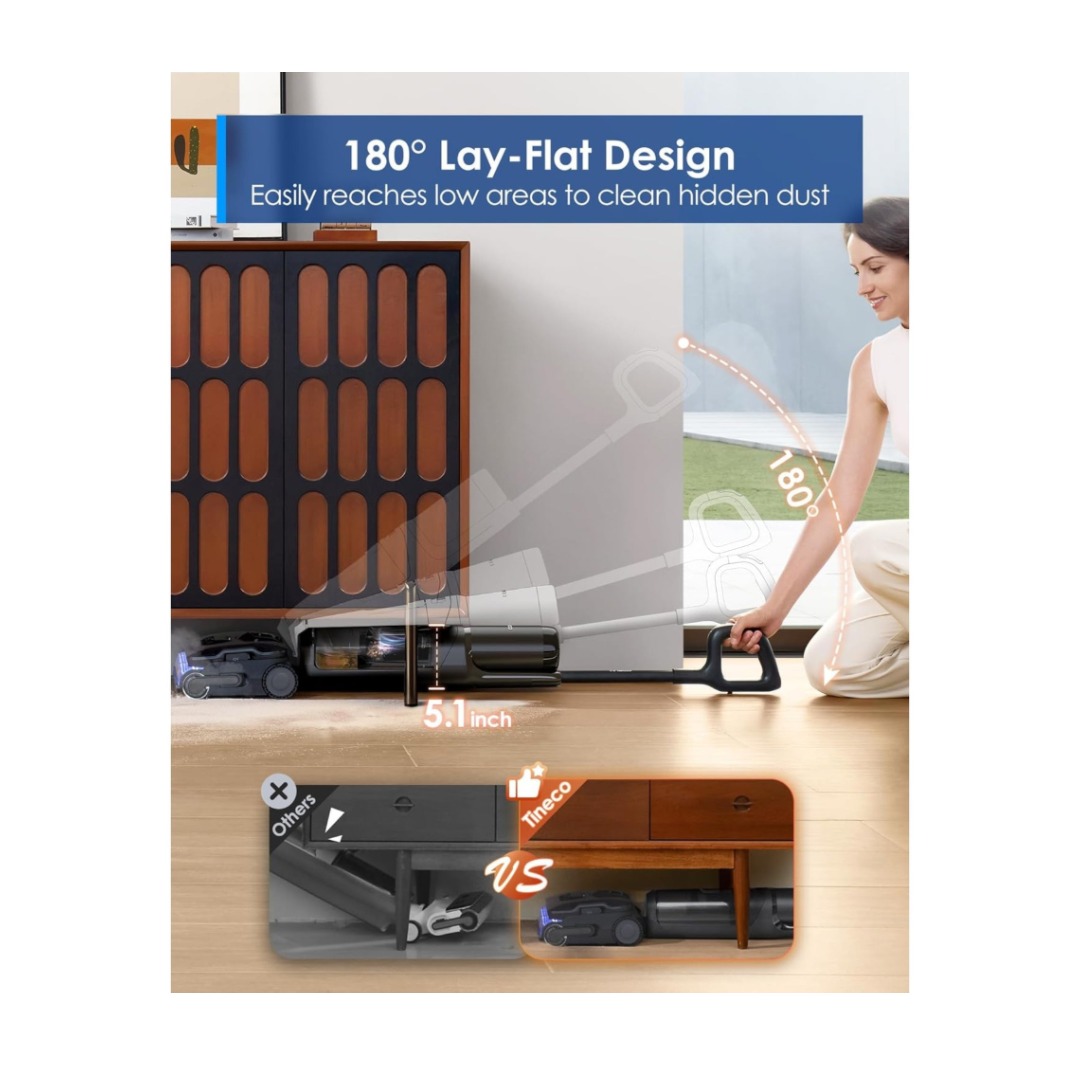 180° Lay-Flat Design: Effortlessly reaches low areas, enabling the cleaning of hidden dust at heights as low as 5.1 inch.
